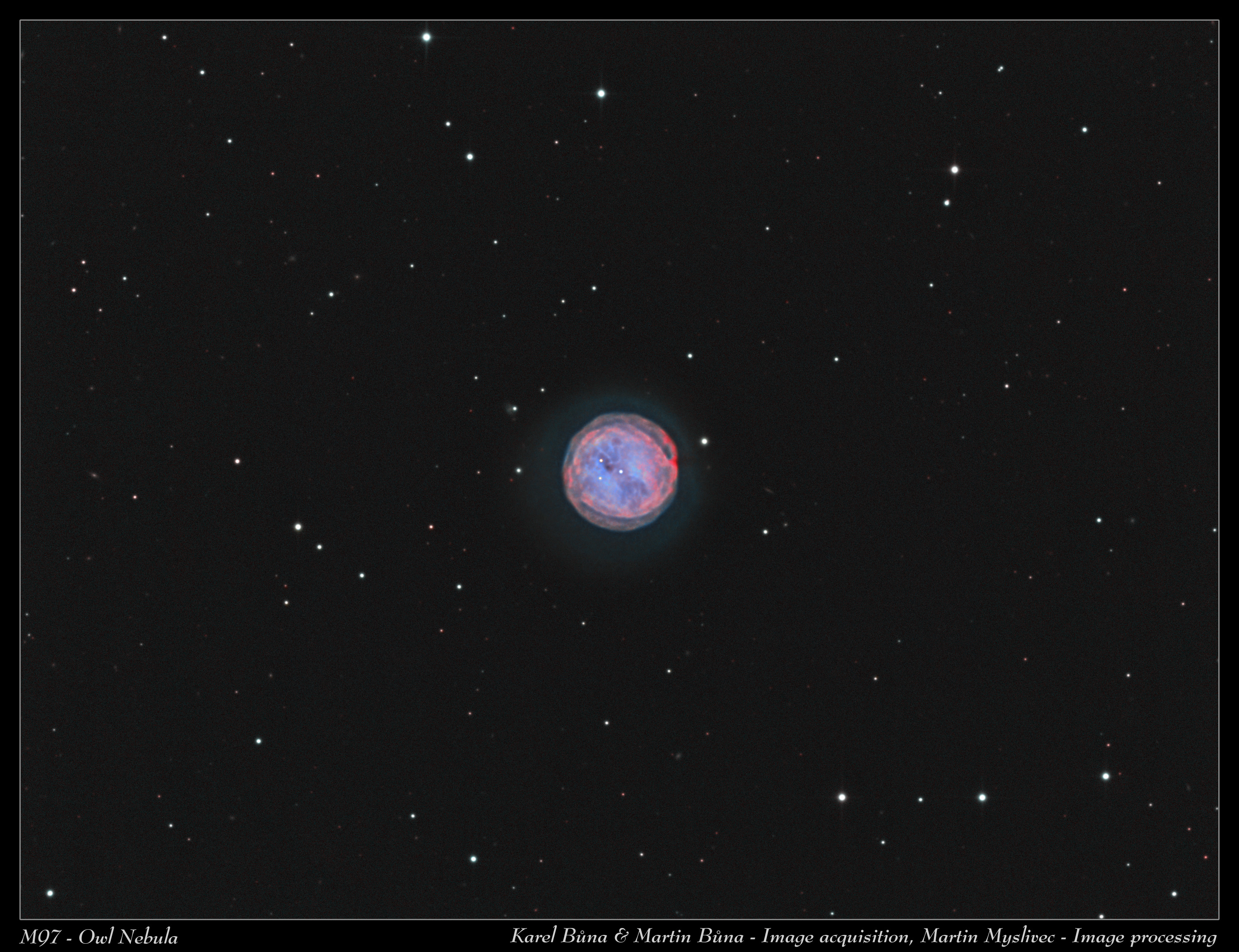 Popis: Veliký dík za kompletní zpracování dat ing. Martinu Myslivcovi. Bicolor verze známé planetární mlhoviny M97-Soví mlhoviny. Špatné podmínky při snímání.