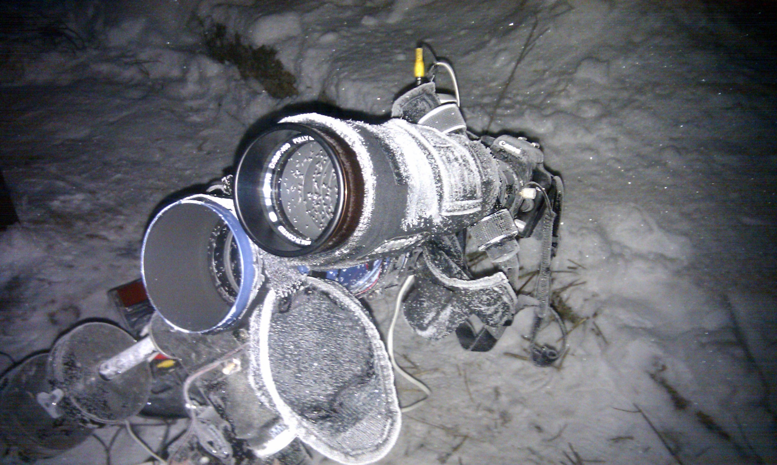 Popis: Názorná ukázka, jak to vypadá, když se fotí v -15°C. Na obrázku je ještě naše staré vybavení - Scopos ED66 na EQ3-2. Foceno v Mříčné u Jilemnice.